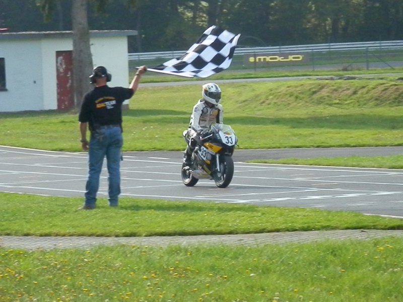 Im ersten Lauf hatte ich einen mäßigen Start und überholte in der zweiten Kurve einen Konkurrenten. Ich fuhr ab diesem Augenblick mein eigenes Rennen auf Platz 11. Als einige Runden vor Schluss noch ein Fahrer vor mir stürzte lag ich auf Platz 10 und fuhr diesen mit 14 sec. Vorsprung auf den hinter mir fahrenden auch sicher nach Hause.