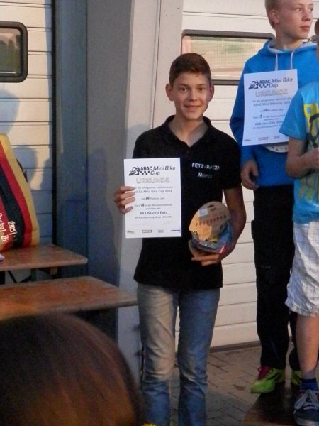 Abends nach der Siegerehrung wurden vom ADAC zu Saisonabschluss die Meister in den Klassen Pocket Bike, Mini Bike-Einsteiger und Mini Bike-Nachwuchs geehrt. Für die 3 Erstplatzierten gab es natürlich Pokale, für alle Anderen eine Urkunde und ein kleines Präsent.
