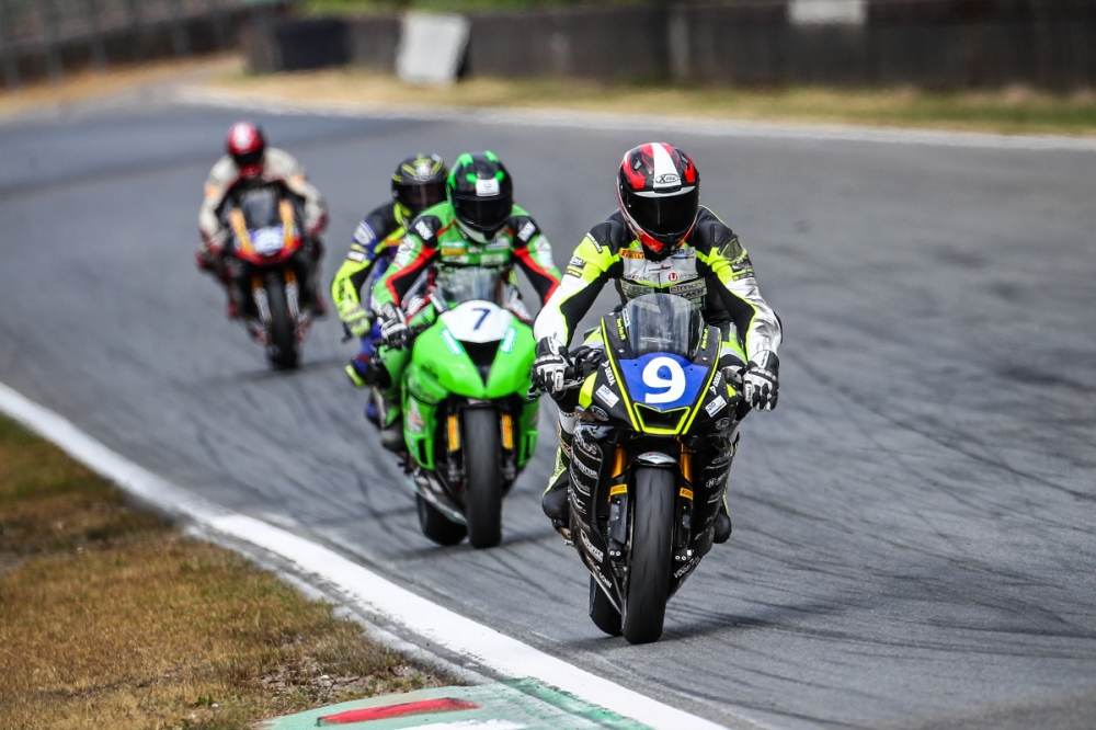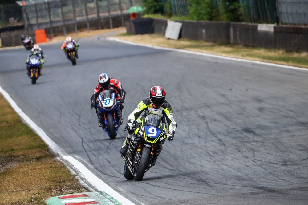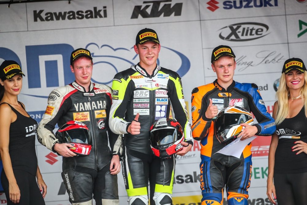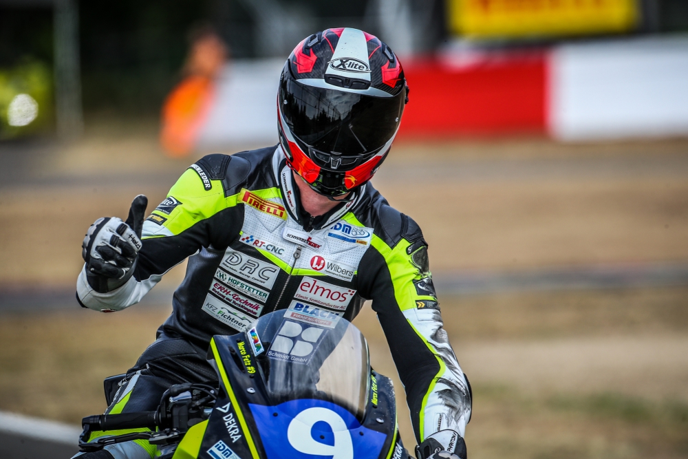 Im zweiten Rennen lief es ähnlich. Marco hatte wieder einen super Start und konnte erneut ein paar Plätze gut machen. Leider wurde er Ende der Gegengerade von Schmidt und einem Supersportfahrer wieder überholt und um einen Sturz zu vermeiden musste Marco etwas aufmachen. Doch Marco konnte gleich an Schmidt dran bleiben und ihn nach ca. 5 Runden überholen. Er fuhr einen Vorsprung von guten 8 Sekunden heraus und überquerte abermals auf P1 in der Stockklasse und diesmal als gesamt 11ter die Ziellinie.
