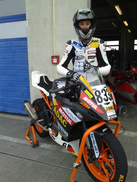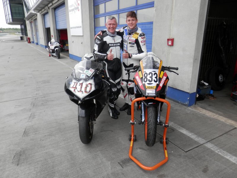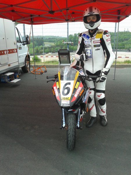 Samstag um 10:00 Uhr ging’s zum ersten Quali. Marco konnte sich noch verbessern und hatte eine 2:02,188 als er kurz vor Ende leider abgeflogen ist. Um eine Kollision zu vermeiden hatte er in Schräglage vorne etwas überbremst und dann ging’s dahin …. Er blieb, außer einer kleinen Prellung an der Schulter, unverletzt. Und so hatten wir auch keine Langeweile bis zum 2ten Quali, denn die KTM musste „auch“ wieder fit gemacht werden. Mit seiner Zeit war er auf P11 (D-P7).