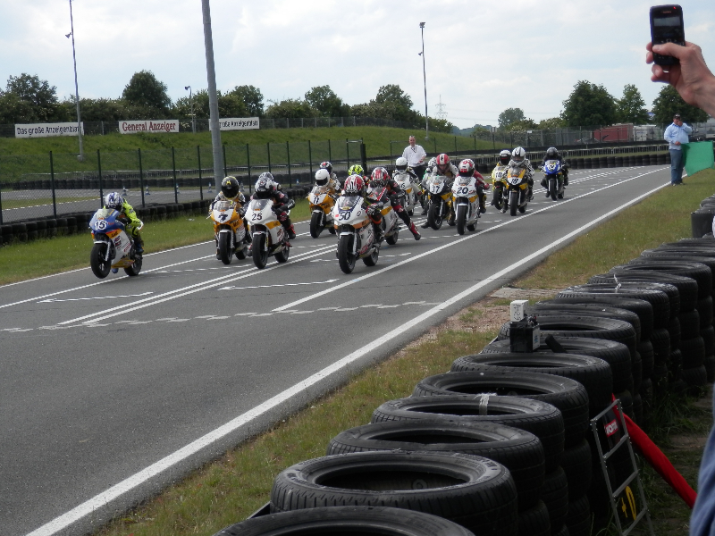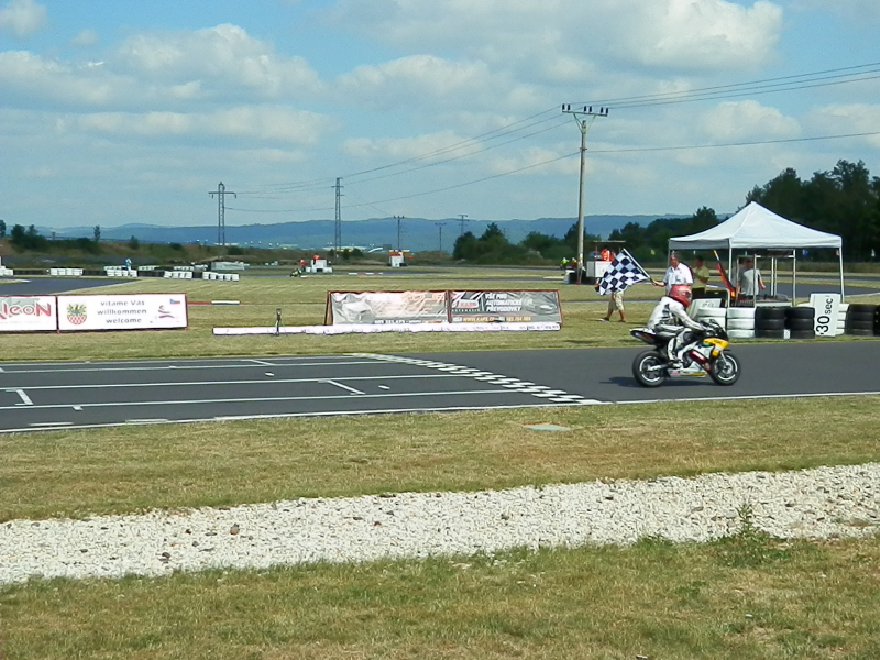 Um 14:05 Uhr startete das erste Rennen (A-Finale Einsteiger, 17 Runden). Marco kam beim Start gut weg, und machte 2 Plätze gut, fiel allerdings schon in der 2. Kurve wieder um 4 Plätze zurück. Er musste leider, um eine Kollision zu vermeiden, in die Bremse greifen. Im Laufe des Rennens kämpfte er sich wieder an 2 seiner Konkurrenten vorbei. In der letzten Runde versuchte Marco noch Niemann auszubremsen, der aber sofort konterte und so überquerte er als 9. den Zielstrich.